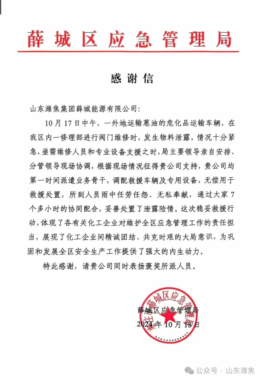 10月18日上午,薛城區(qū)應急管理局黨 委書 記、局長王鋒,副局長張海龍一行向薛城能源公司送來感謝信,副總經(jīng)理陳兆財?shù)葻崆榻哟?/div>